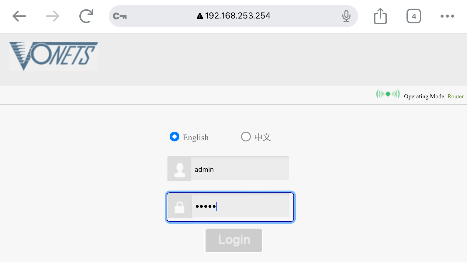 Open the WiFi settings of your tablet/phone and join the VONETS WiFi connection. The default password is 12345678. Open your Internet browser and enter the IP address 192.168.253.254.