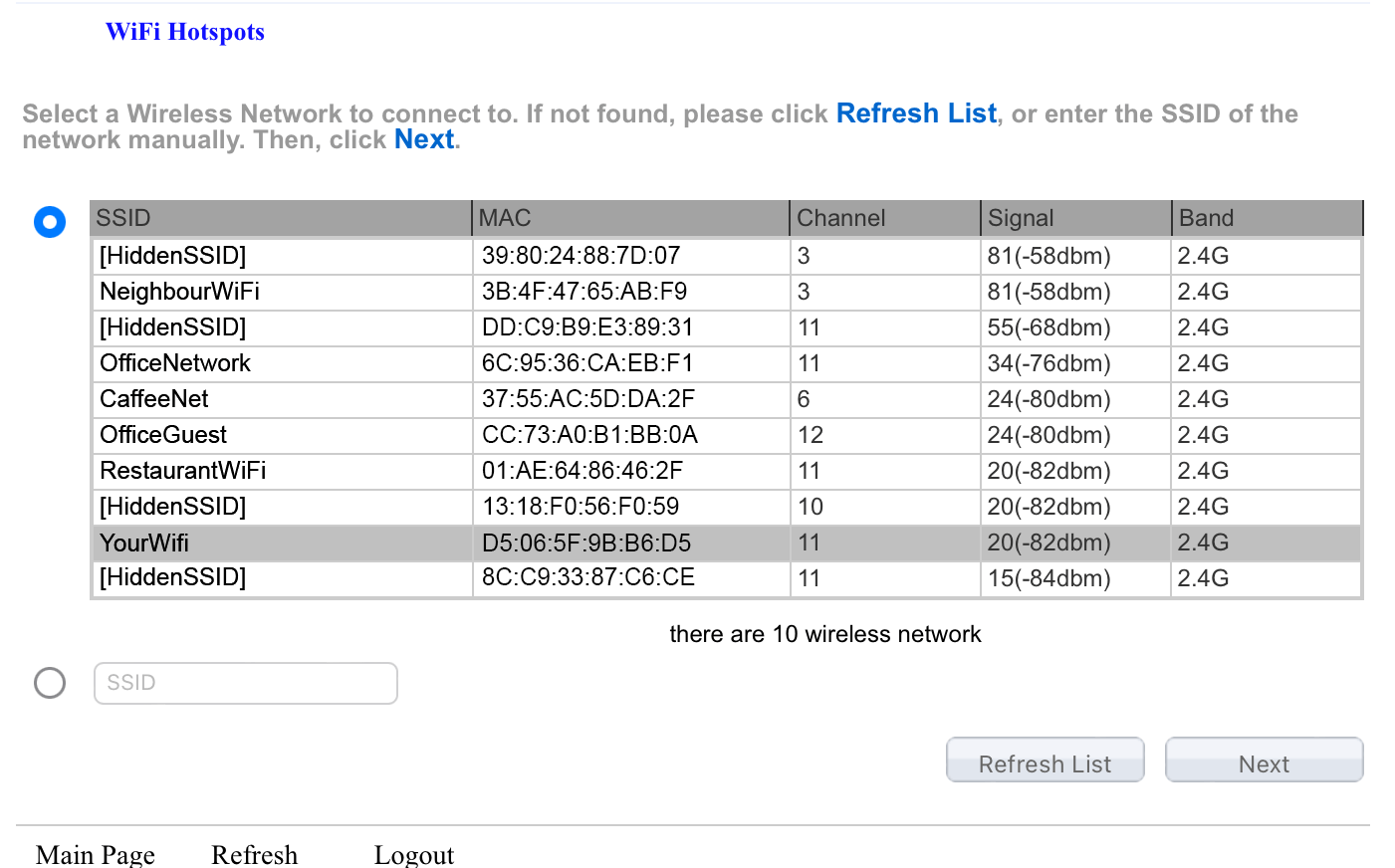 In the Wifi Hotspots menu, wait until the device searches for all available WiFi networks. Choose the SSID of your own WiFi network and enter its password. Tap on the Apply button.