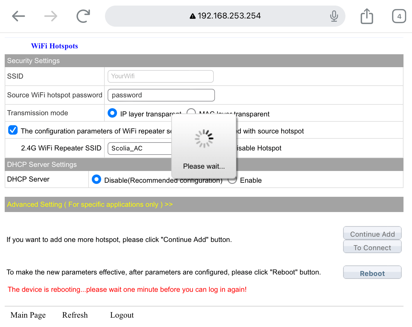 The data has now been transferred to the router. Now reboot the Mini Wifi Adapter with the Reboot button below. This will change its operating mode from Router to WiFi Bridge. If you see the green LED on the Mini Wifi Adapter, it means it has restarted in WiFi Bridge operating mode. Access to the adapter via the browser is no longer possible now, so you can close the browser, even if you still see the “Please wait…” alert window.
